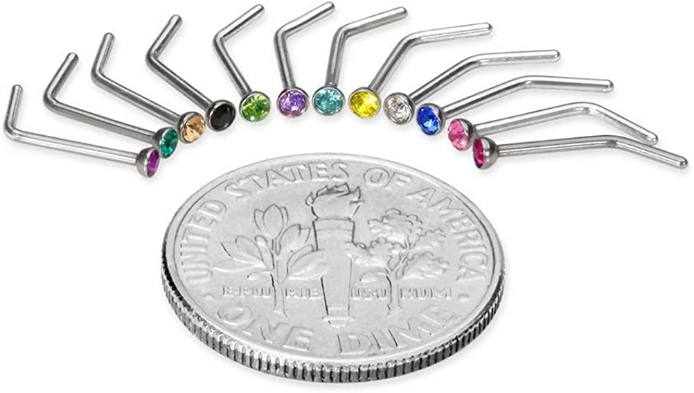 Quantity: 20 pieces of L shaped nose studs which is different colors, enough for your choices.