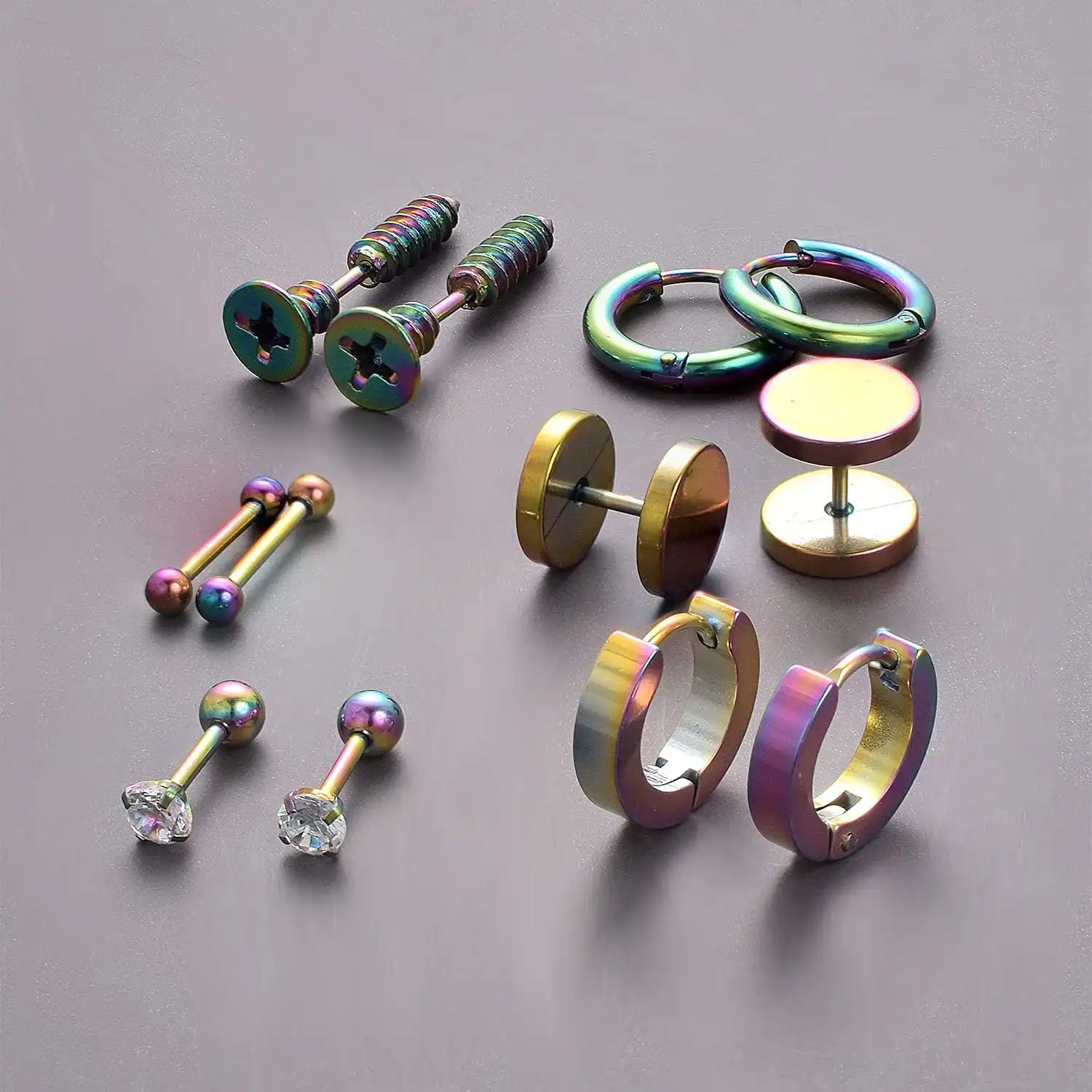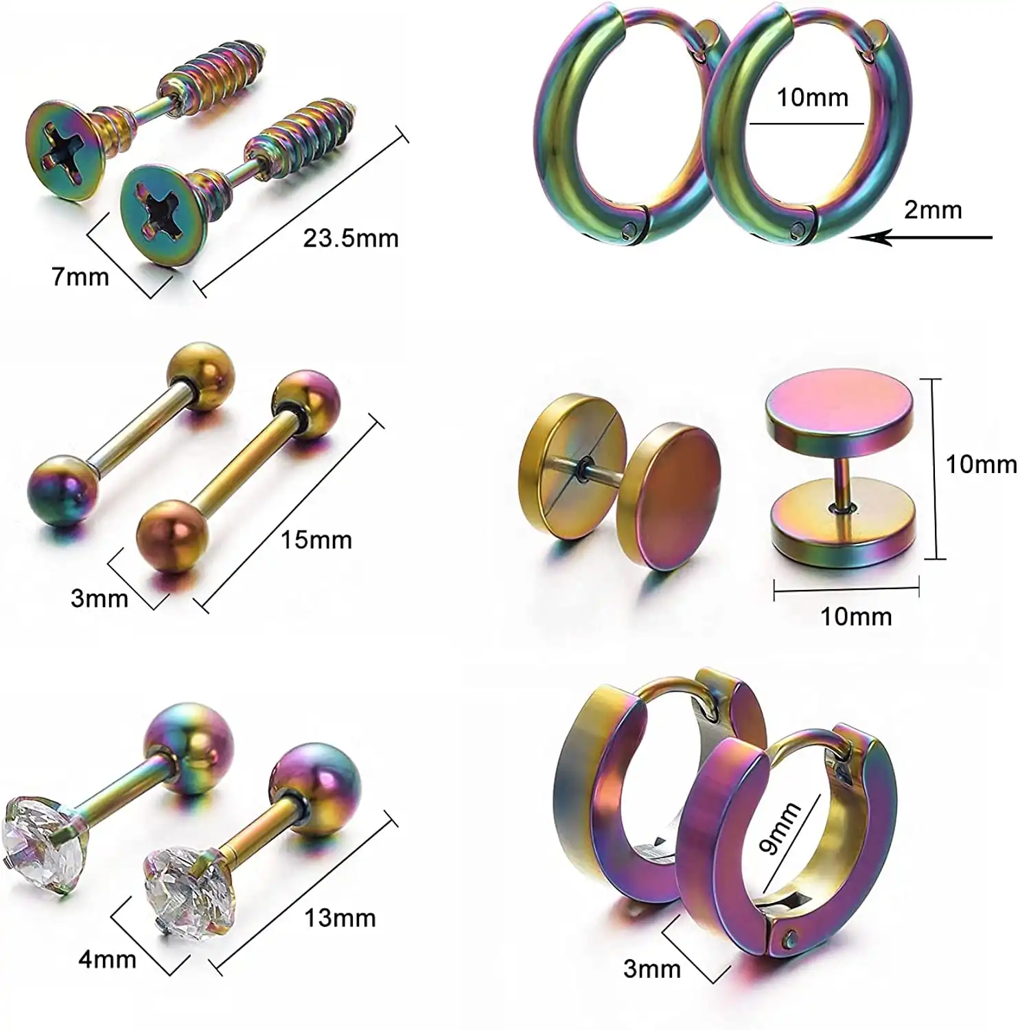 6 Pairs of high-quality stainless steel Earrings Can Match your Different Styles of Clothing. The shapes are hoop, dumbbell, Spiral and round. They are cute, Funny, Charming and will surprise you.