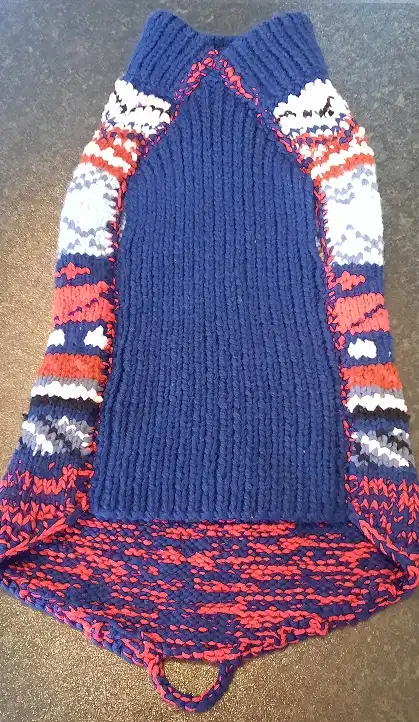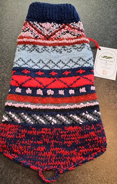 Medium sized dog jumper in Doubled Double knit wool to make a lovely warm jumper for your dog. Measures 16″ around chest and 14″ from collar to tail base. Knitted by hand in the home by Trudi with an intricate fair aisle design which makes this thicker and therefore warmer than usual. This is a one-off unique design.
