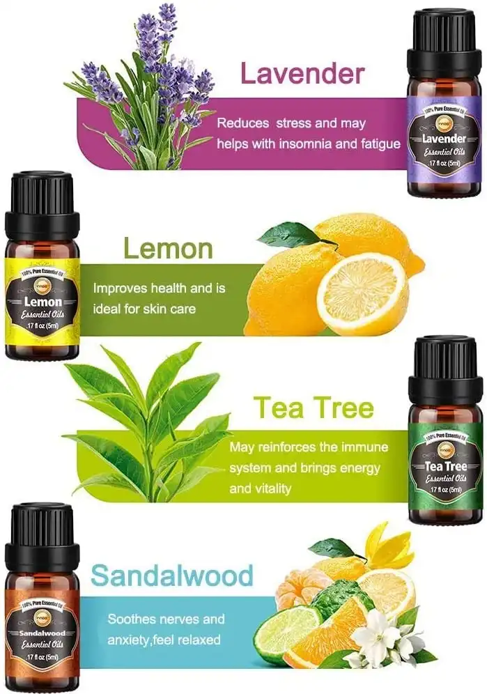 Each of the aromatherapy diffuser oil has its own special therapeutic benefit, including health and well being. reduce anxiety, clean skin, strengthen immune system, refreshing Air, treat Insomnia, relieving joint and muscle pain etc…, which helps you achieve greater mind acuity & promote & and happiness