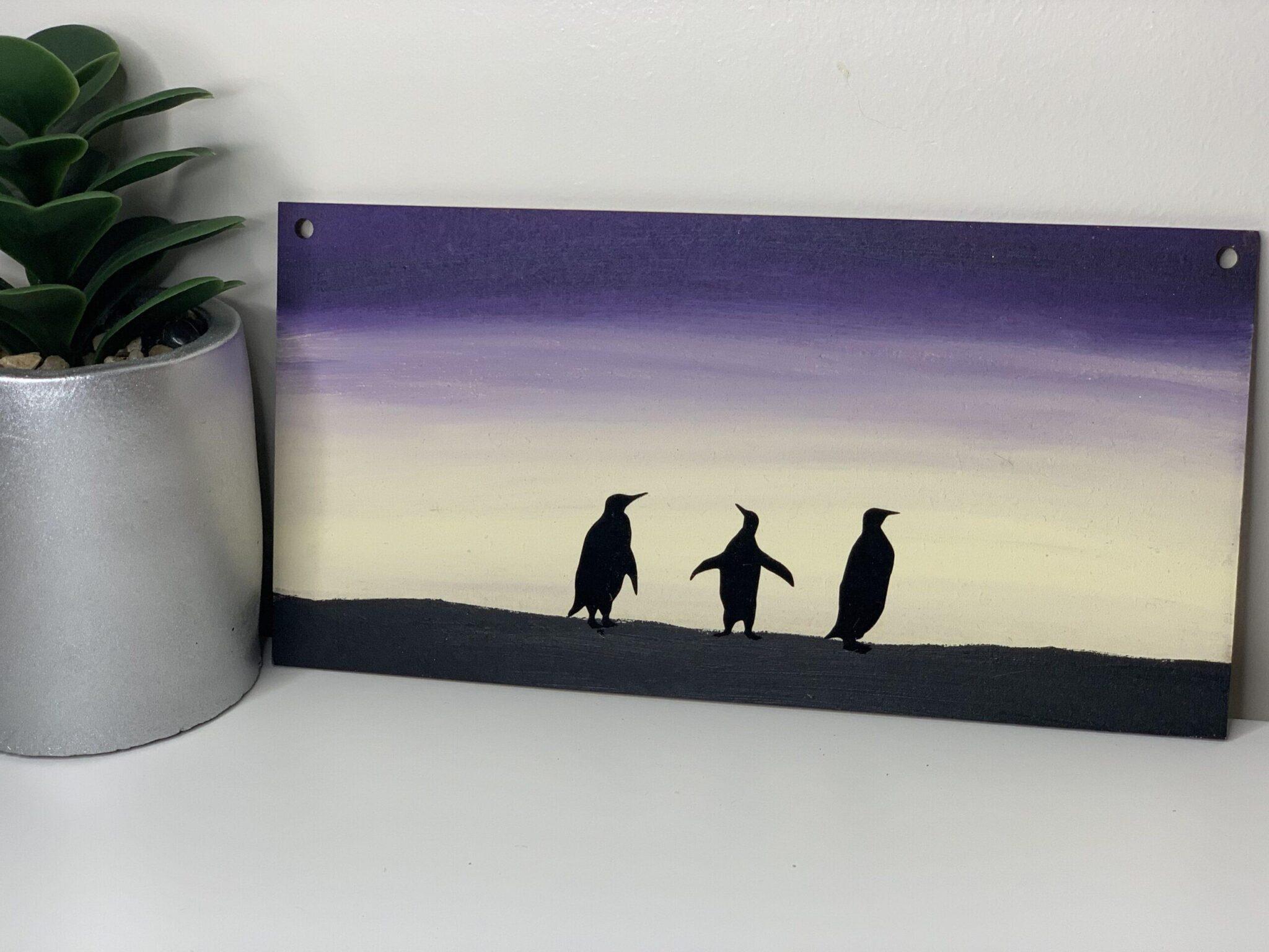 Acrylic penguin painting on a lightweight mdf hanging sign.