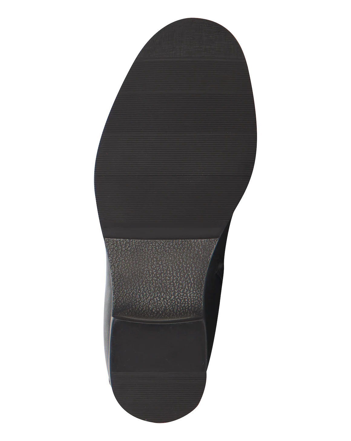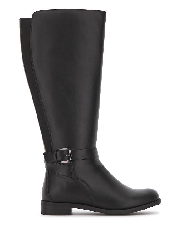 The classic riding boot features a leather look upper, stretch panel for comfort and fit, buckle strap detail and stacked heel.