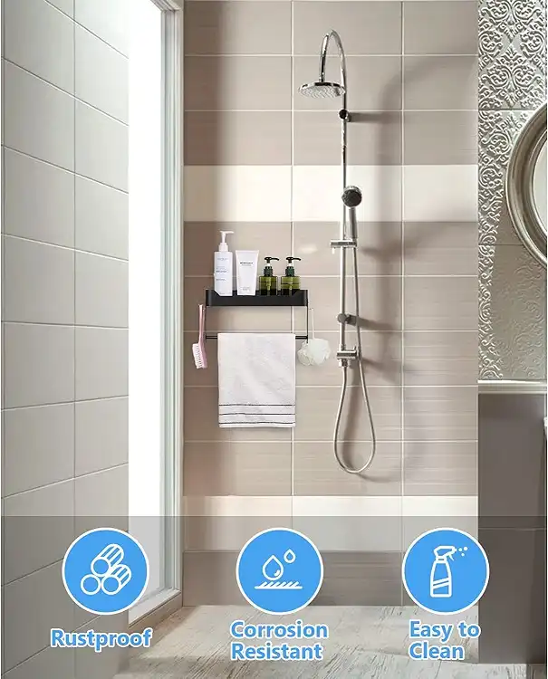 The towel rack with shelf can be used as roll holder, spice rack & shower shelf.