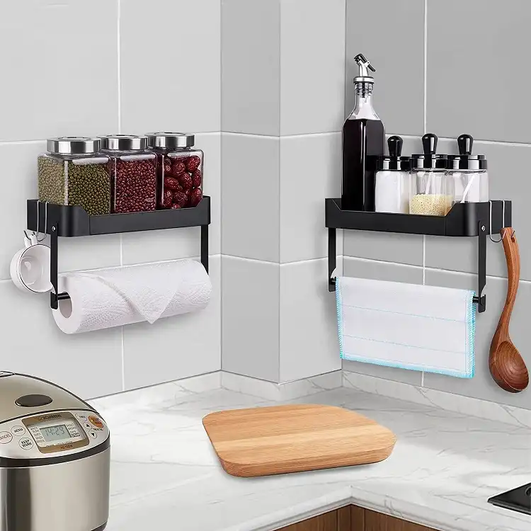 You will get : 1 x shower shelf; 2 x movable hooks; 2 x connecting hooks; 1 x hanging rod. The spice rack with shelf will help keep your kitchen clean and tidy, and keep your spices and paper towels up out of the way